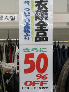 今年も1月3日~9日までの1週間、【衣類全品50%OFFセール開催中です!】